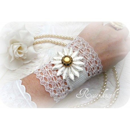 Nostalgische Akzente erhält die Spitzenmanschette durch die seidenmatt glänzende Blüten Applikation in Ivory die an eine Margerite erinnert.