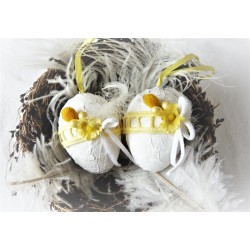 lll➤ Zauberhafte, weiße Ostereier im Shabby Stil stehen hier zur Wahl. Durch eine spezielle Technik entsteht die reizvolle, reliefartige Struktur. Die Eier wurden mit einer Papierschnur in Gelb/Weiß mit aufgefädelten Holzperlen und einer Vintage Stoffrose in Ivory verziert.Sie wirken im Osterstrauß ebenso, wie in einem mit Federn ausstaffierten Nest.