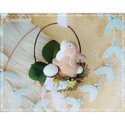 lll➤ Ostergesteck mit einem kleinen, von mir gefertigten Stoffhasen in Ivory. Der Hase sitzt auf einer länglichen Platte die üppig mit Rüsche, Blättern, Blüten, Spitze und Federn verziert wurde. Diese aparte Ostergesteck passt perfekt zum Brocante- Shabby- Vintage oder Landhausstil.