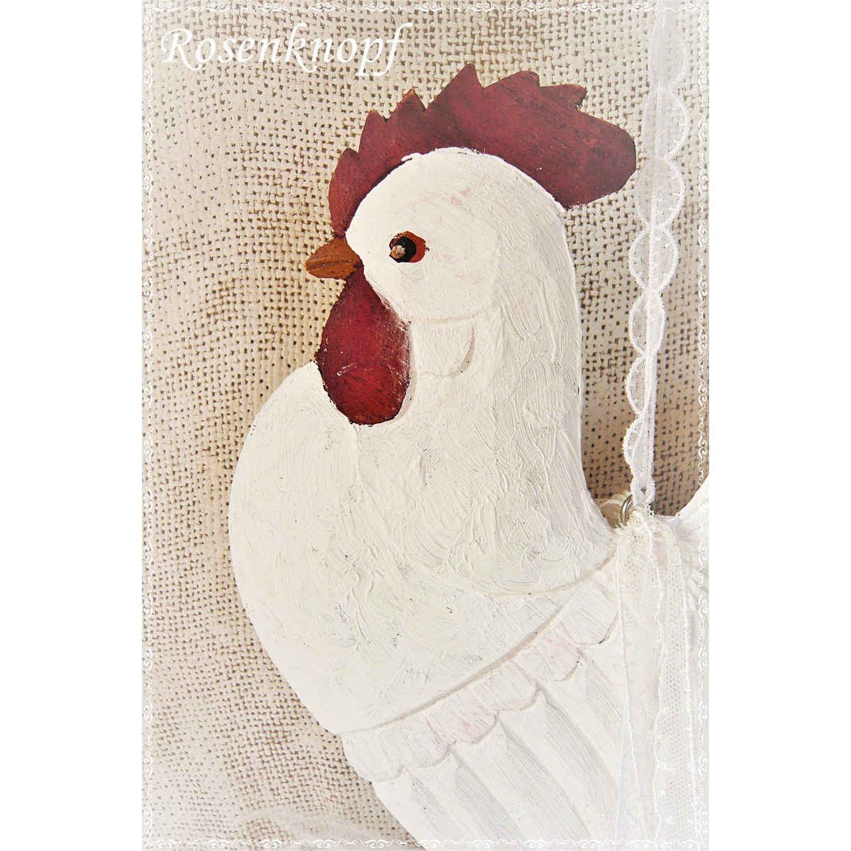 Der Gockel stammt aus den 1980gern, und war ziemlich bunt, daher habe ich ihn bis auf den Schnabel, Kamm und Kropfsack weiß bemalt.