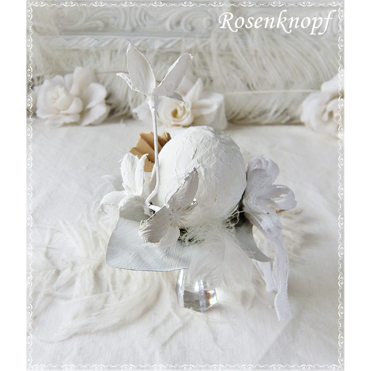 Kleines und wunderschönes Ostergesteck mit einem weißen Ei, das in Découpage Technik bearbeitet und weiß bemalt wurde.