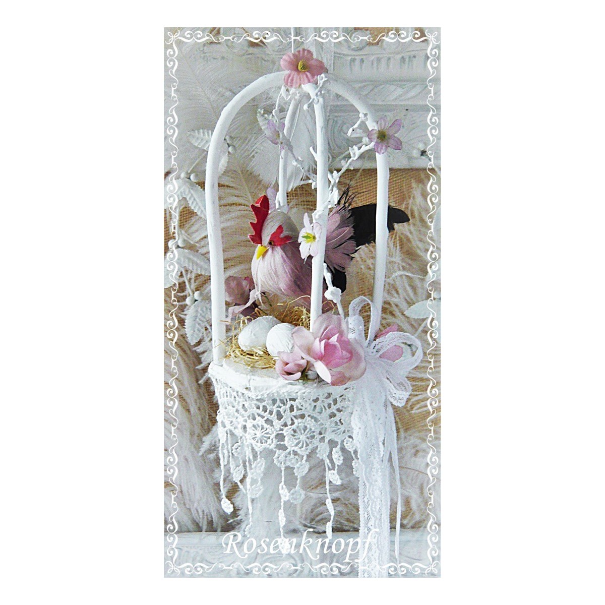 Federn, Blüten, Eier und eine Schlaufe aus Spitzenband schmücken sein Gehege.
