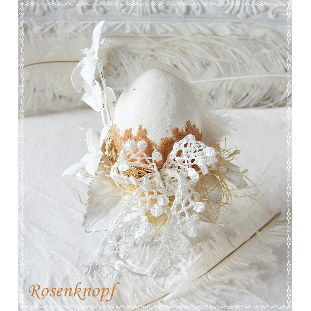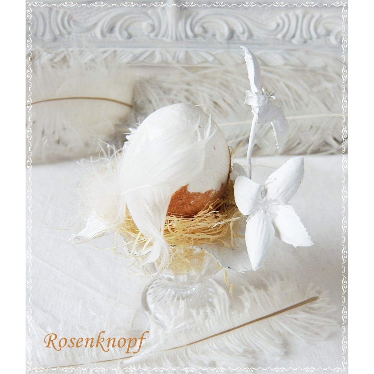 Material: Glas Eierbecher, Holzwolle, Spitzenborte, Farbe, Watteei, Künstliche Zweige und -Blätter, Echte Hühnerfeder