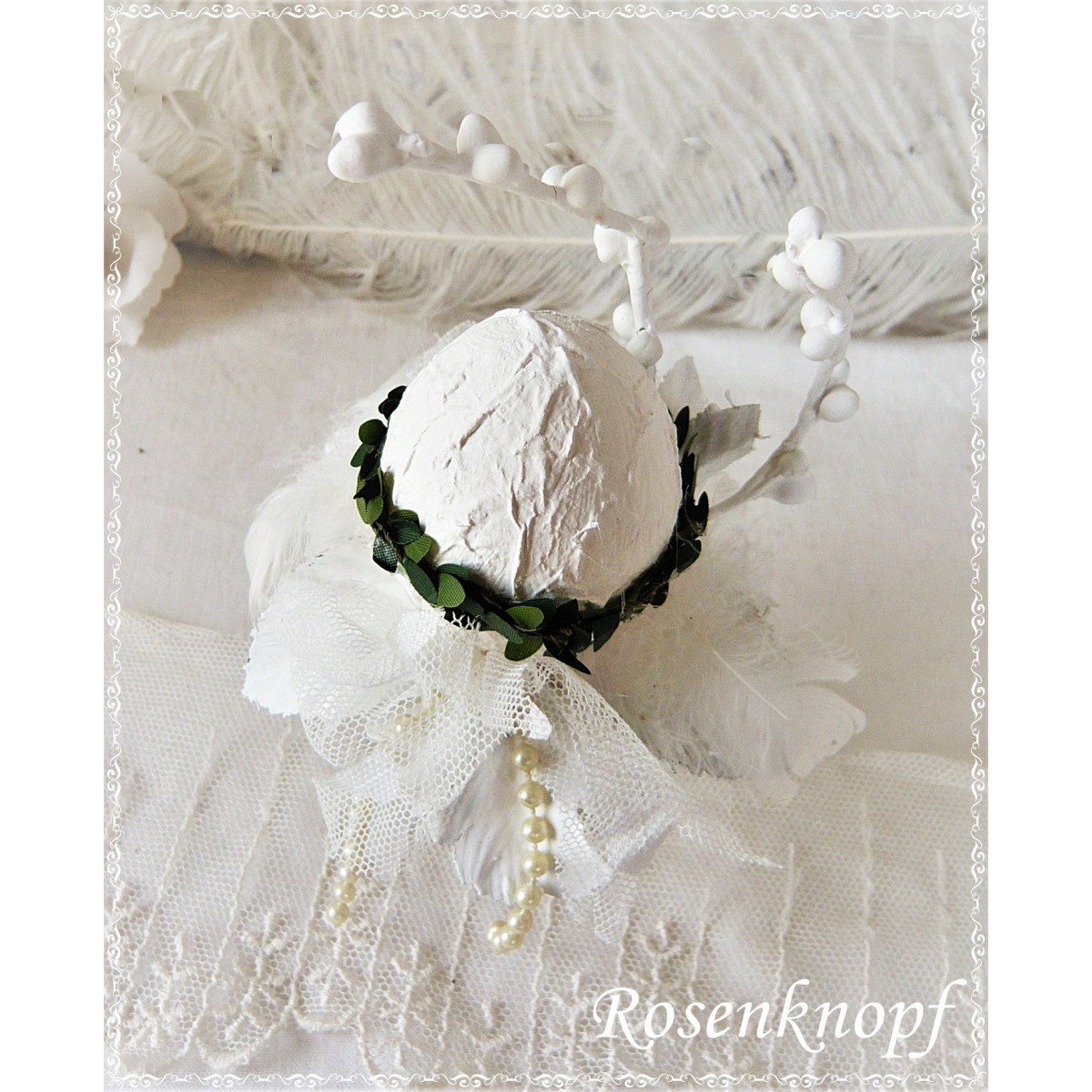 Kleines und wunderschönes Ostergesteck mit einem weißen Ei, das in Découpage Technik bearbeitet, weiß bemalt und mit einem schmalen Blätterkranz in Dunkelgrün verziert wurde.