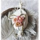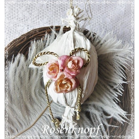 Verziert mit einer Schleife aus brauner Baumwollkordel, drei Röschen und weißer Feder ergibt sich so ein edler Osterschmuck der zum Brcante- Shabby- Vintage- und Landhausstil passt.