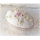 Der Deckel dieses großen Motiveis wurde mit einer auffälligen Spitzenapplikation in Ivory, Wachsperlen, einer Stoffblüte in Altrosa und Perlenstempeln in Pink verziert.