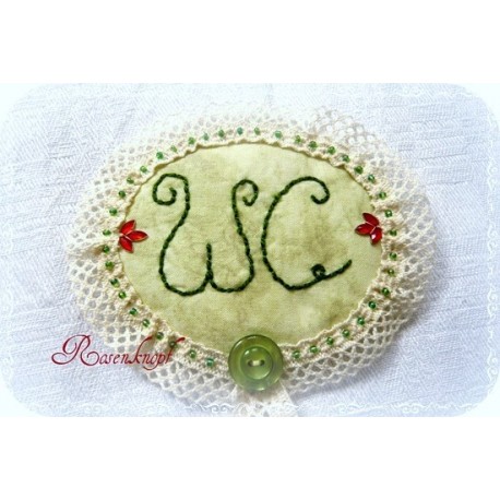Gefertigt aus hellgrünem Stoff und mit feinem Baumwollgarn bestickt wurde das Türschild mit Vintage Klöppelspitze in Ivory eingerahmt.