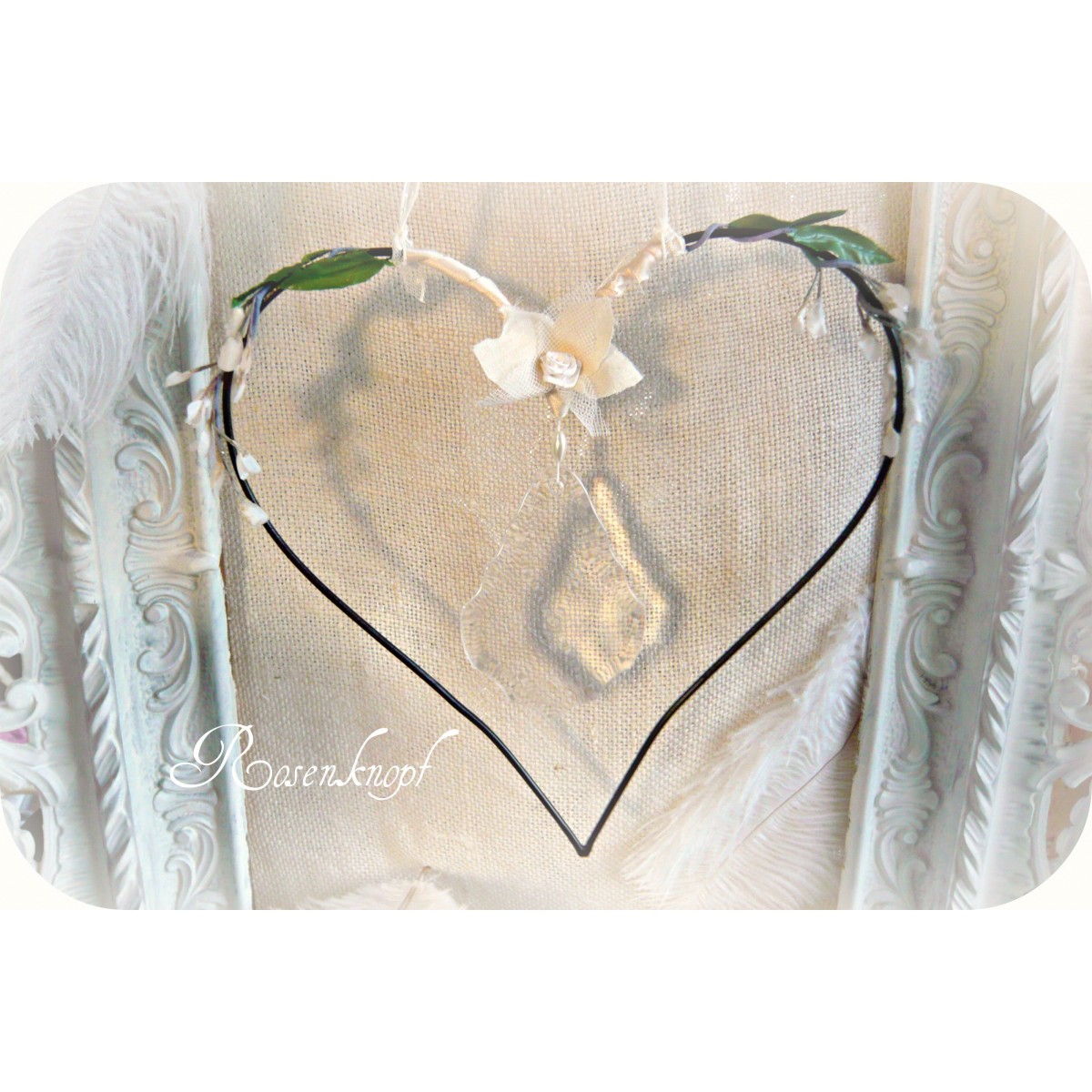 Filigranes Herz aus Draht, fein dekoriert mit einem künstlichen Blütenzweig und Stoffblüte mit Röschen in seiner Mitte.
