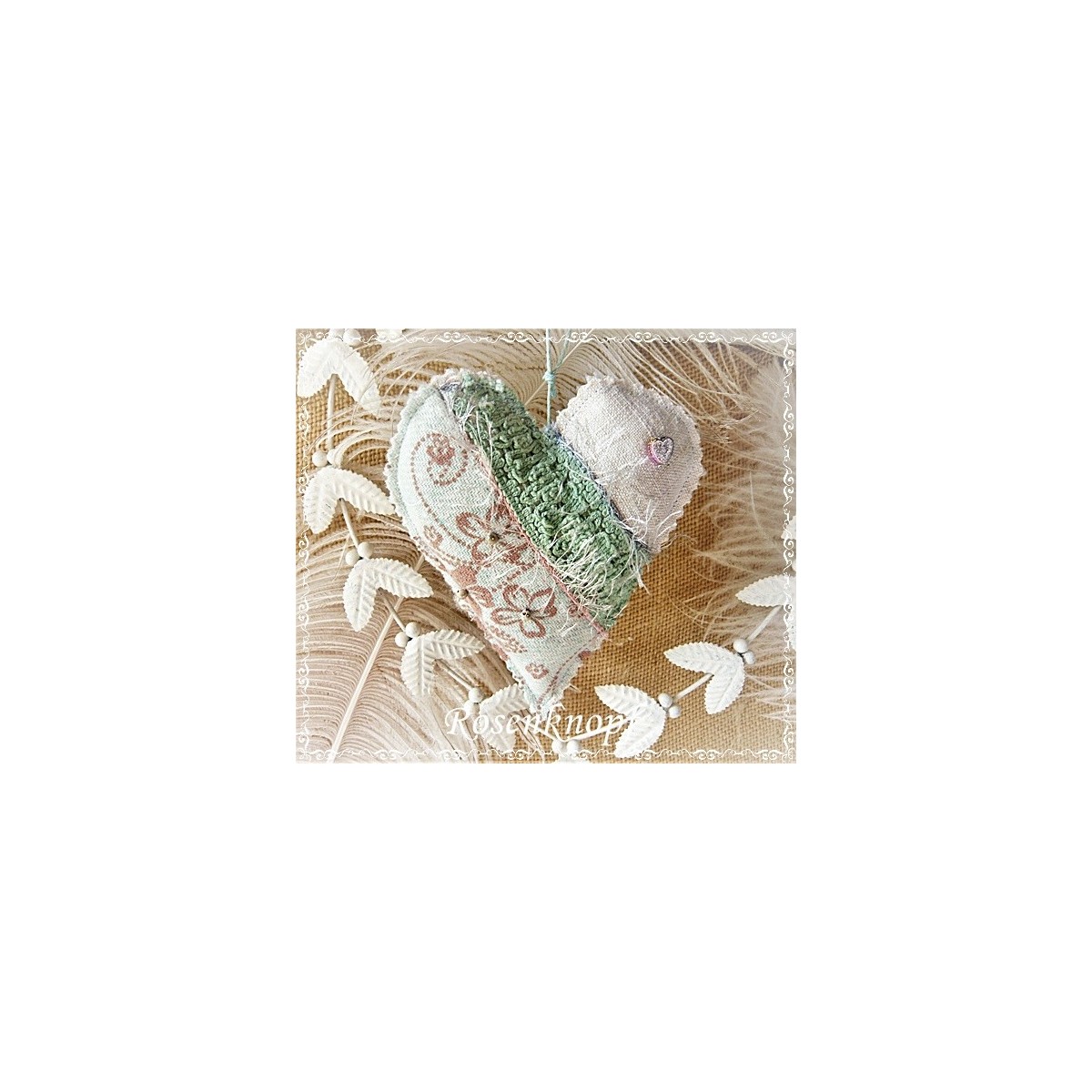 Dieses romantische und einzigartige Stoffherz wurde aus Vintage Leinen und Stoff in Ivory und Mint gefertigt und mit Spitze, Effektgarn, kleinem Metallherz und Perlen verziert.