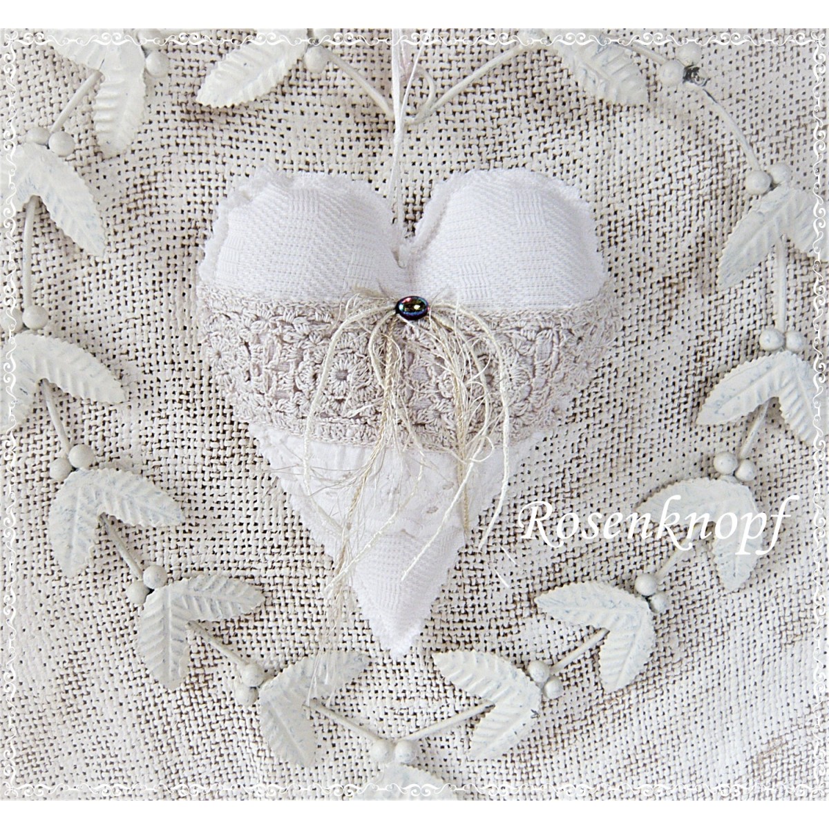 lll➤ Upcycling Herz/Stoffherz aus weißem Wäscheleinen, verziert mit Häkelborte in Ivory, Perlen und Effektgarn.