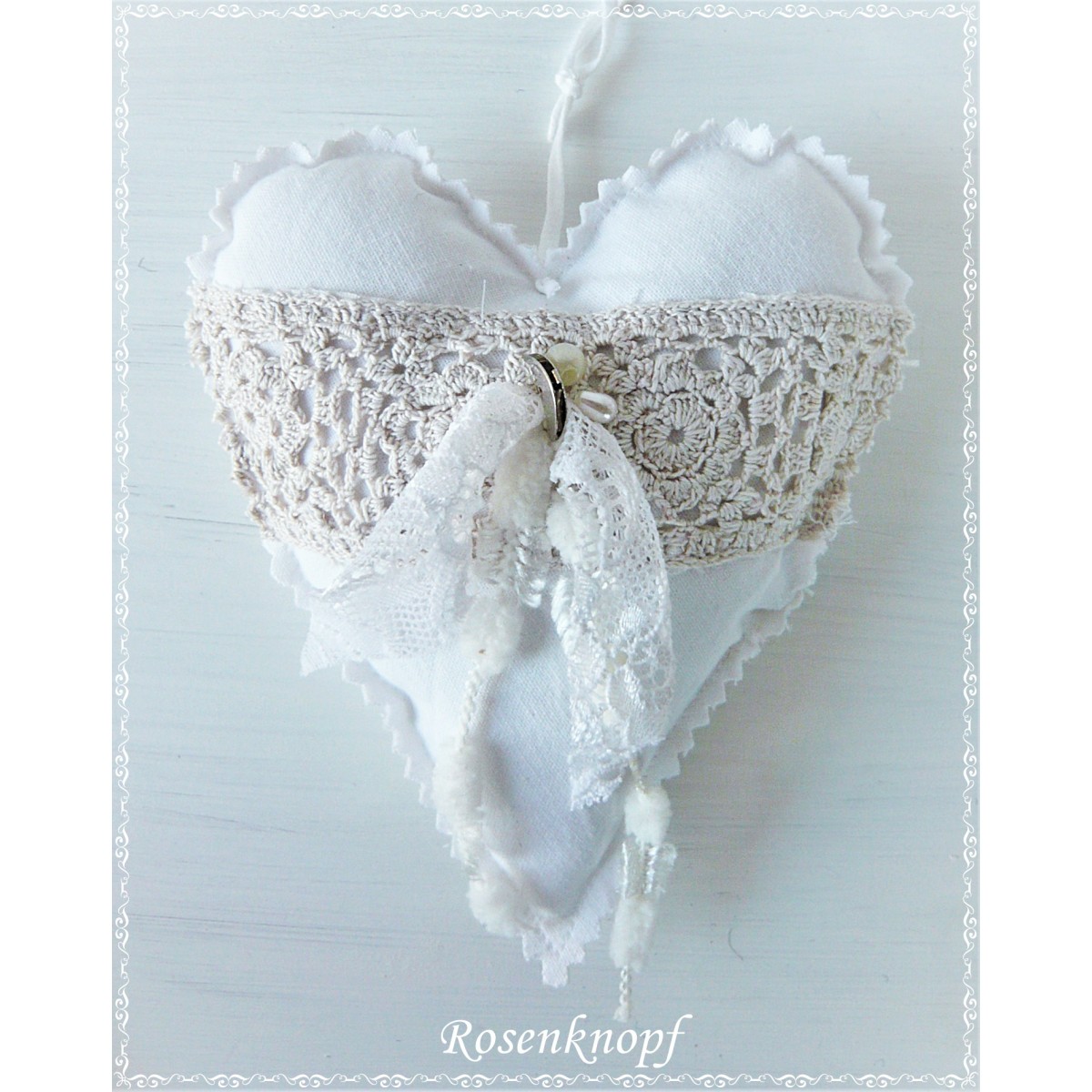 lll➤ Upcycling Herz/Stoffherz aus weißem Wäscheleinen, verziert mit Spitze, Perle und Effektgarn in Weiß und Ivory.