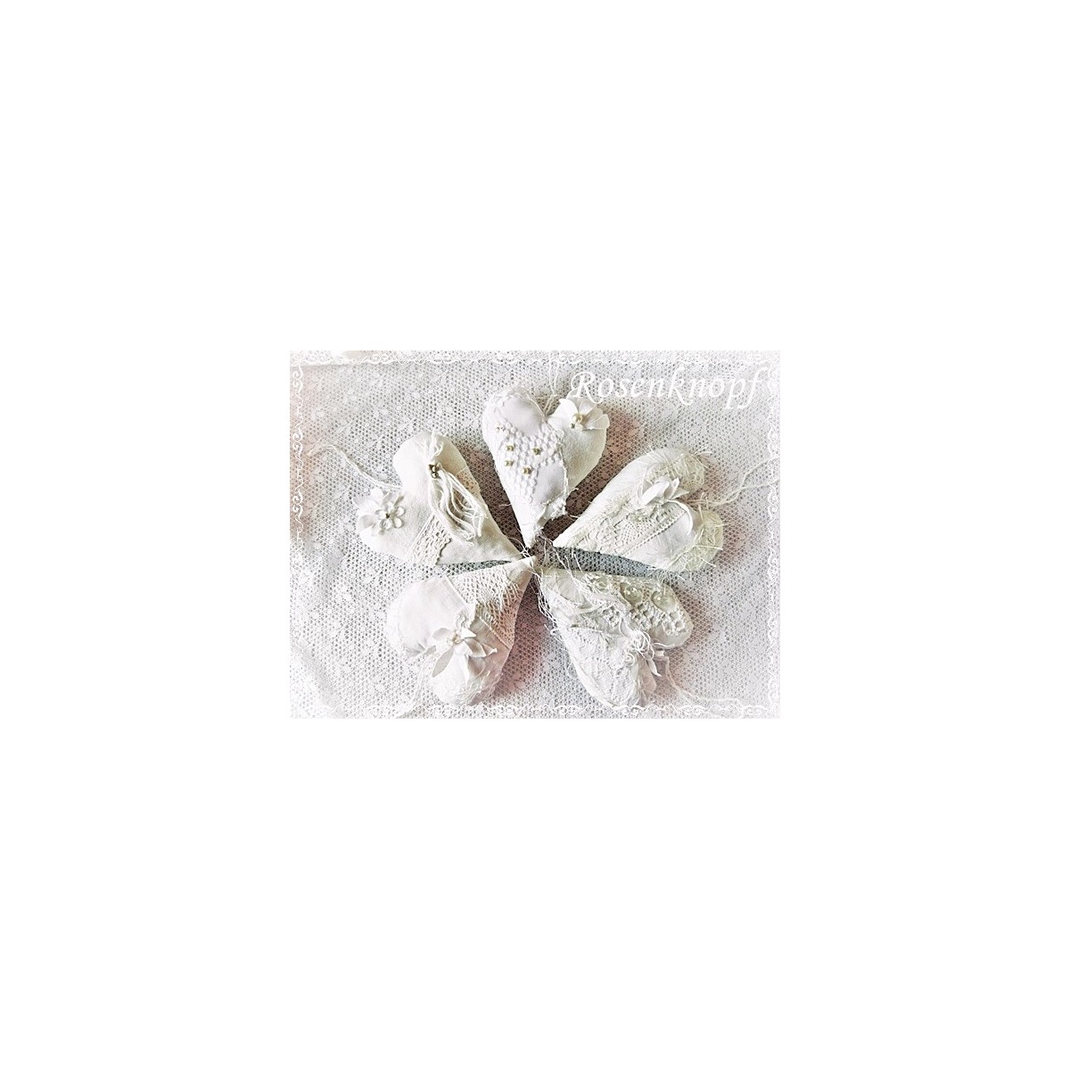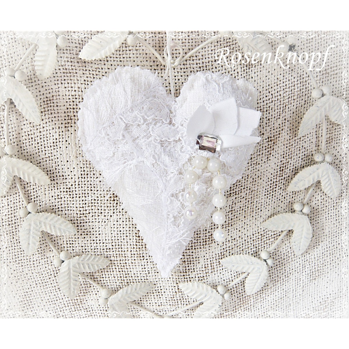 lll➤ Upcycling Herz/Stoffherz aus weißem Wäscheleinen, verziert mit Spitze, Perlen und Effektgarn und Spiegelperle.