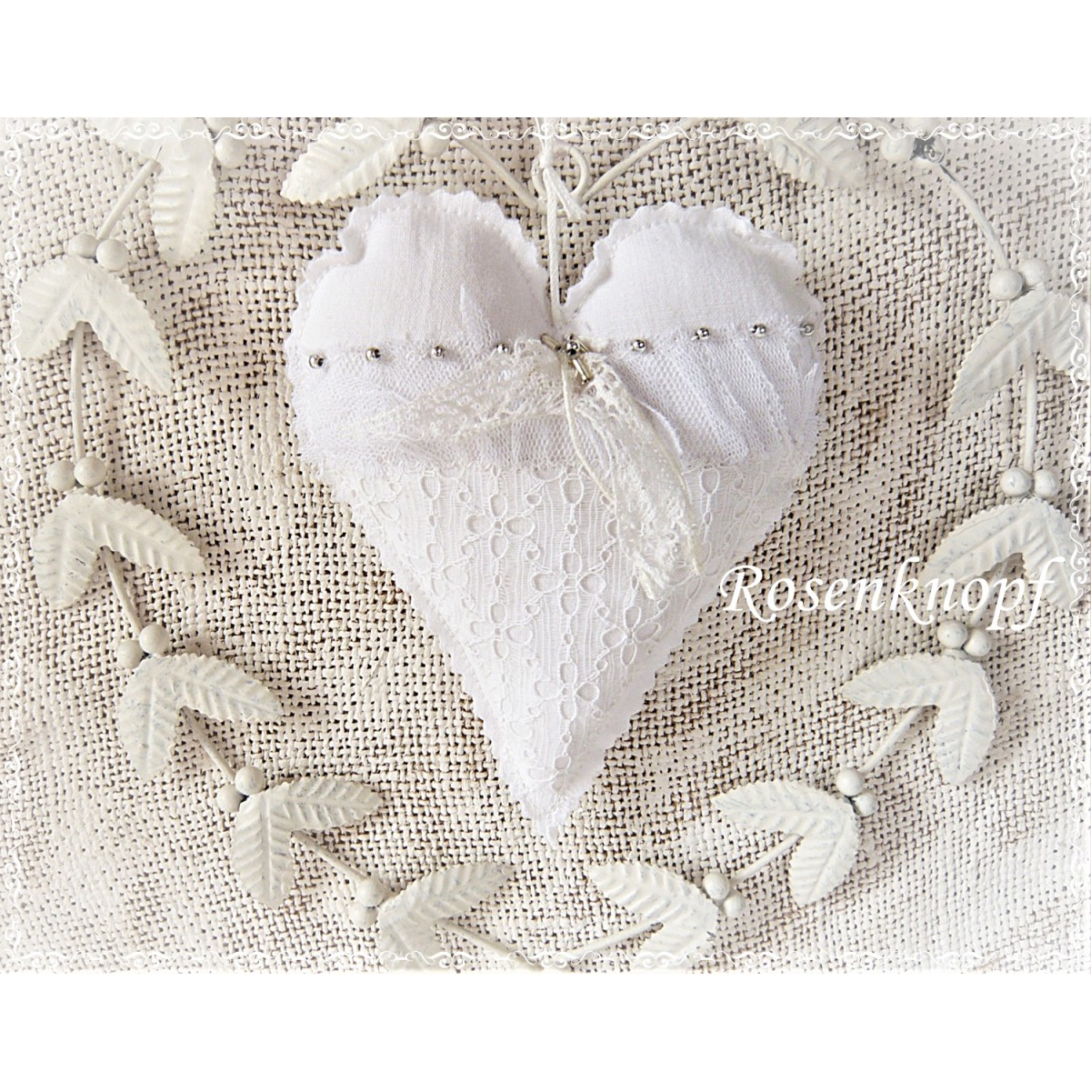 Dieses romantische und einzigartige Herz wurde aus weißem Vintage Leinen gefertigt und mit Batiststickerei Spitze, Tüll und Perlen in Silber verziert.