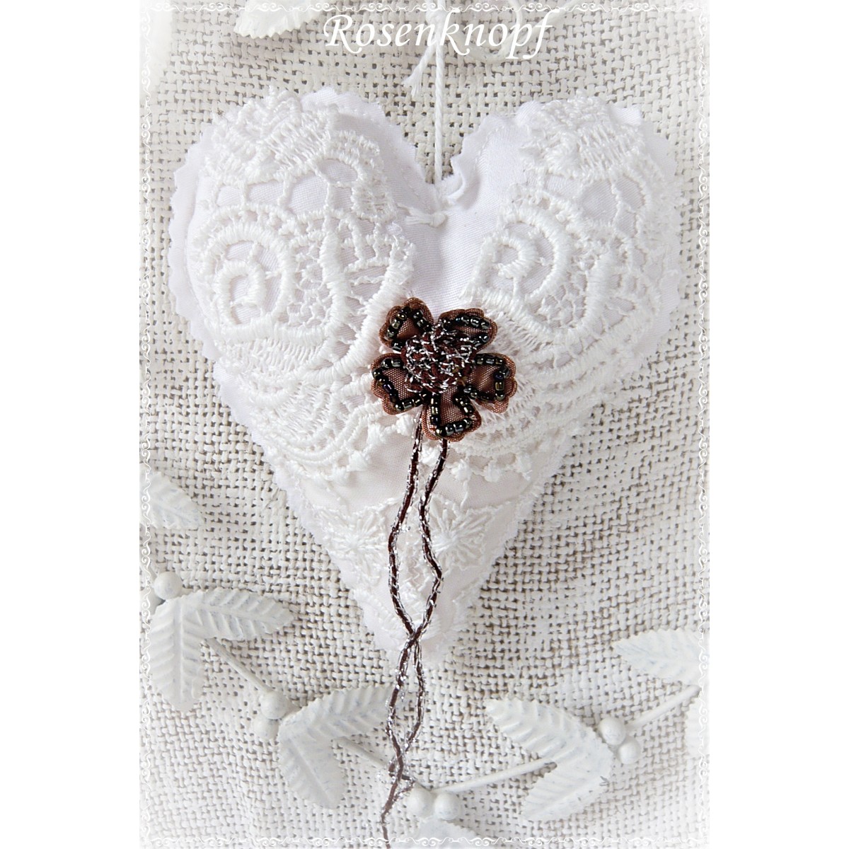 lll➤ Upcycling Herz/Stoffherz aus weißem Wäscheleinen, verziert mit Ätzspitze in Weiß, Stoffblüte und Perlen.