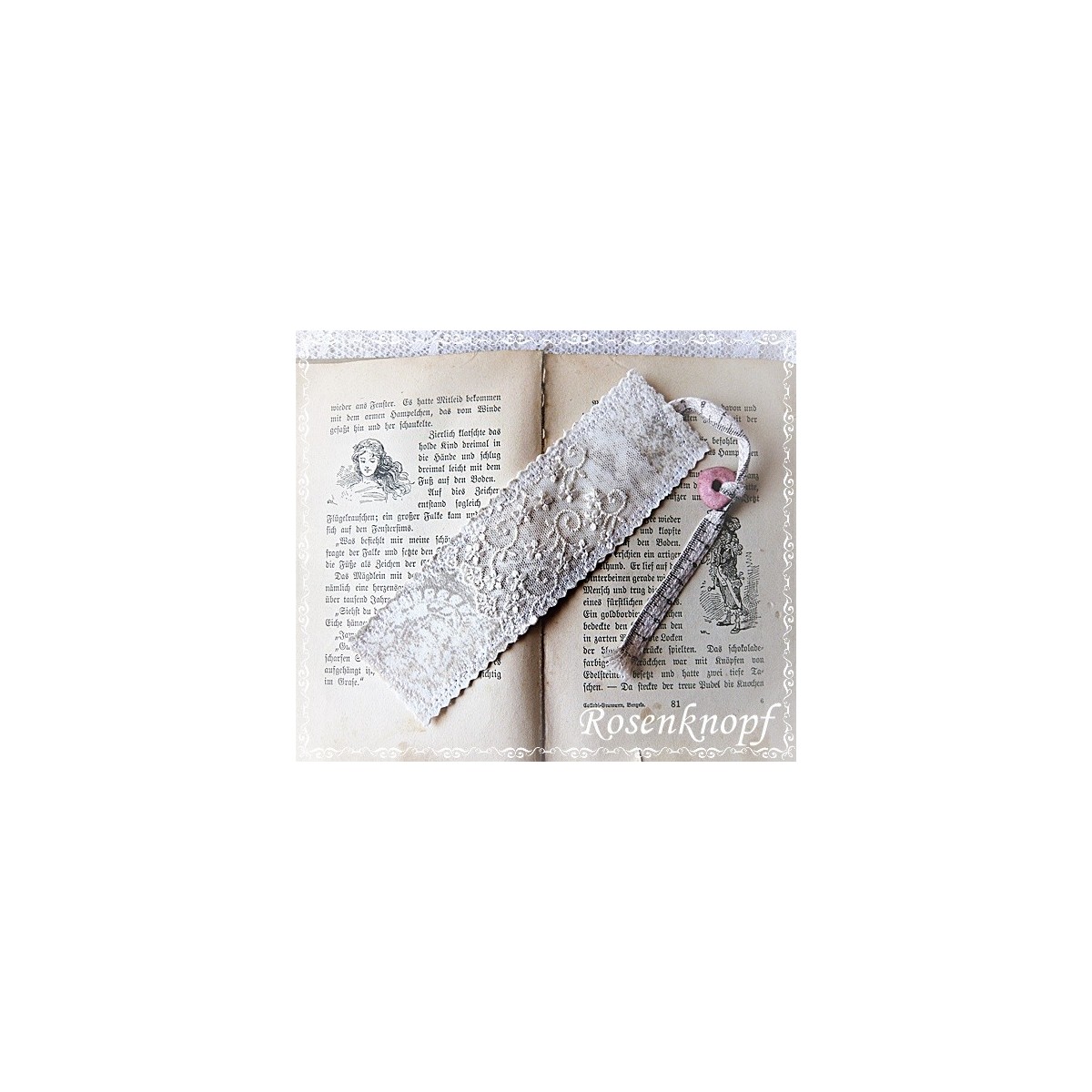 Im Shabby Stil mit bestickter, französischer Tüllspitze, extravagantem Baumwollband und großer Tonperle verziert, wird Bücherlesen mit diesem Lesezeichen zum reinsten Vergnügen!