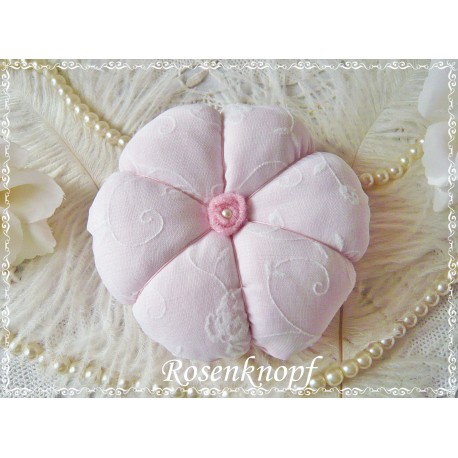 Dieses einzigartige Nähkissen wurde aus Baumwolle in Rosa genäht und mit weißer Viscose mit Batist-Stickerei belegt.
