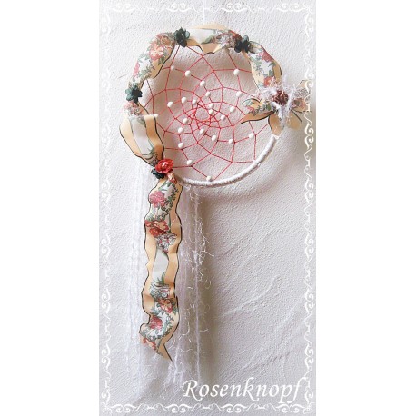 Verspielte Akzente erhält der Dreamcatcher durch aufgefädelte Glasperlen im Geflecht aus apricotfarbener Wolle, das wunderschöne floral bedrucke Textilband das ich am linken Rand hübsch drapiert und mit petrolfarbenen Blüten und Röschen in Apricot verziert habe.