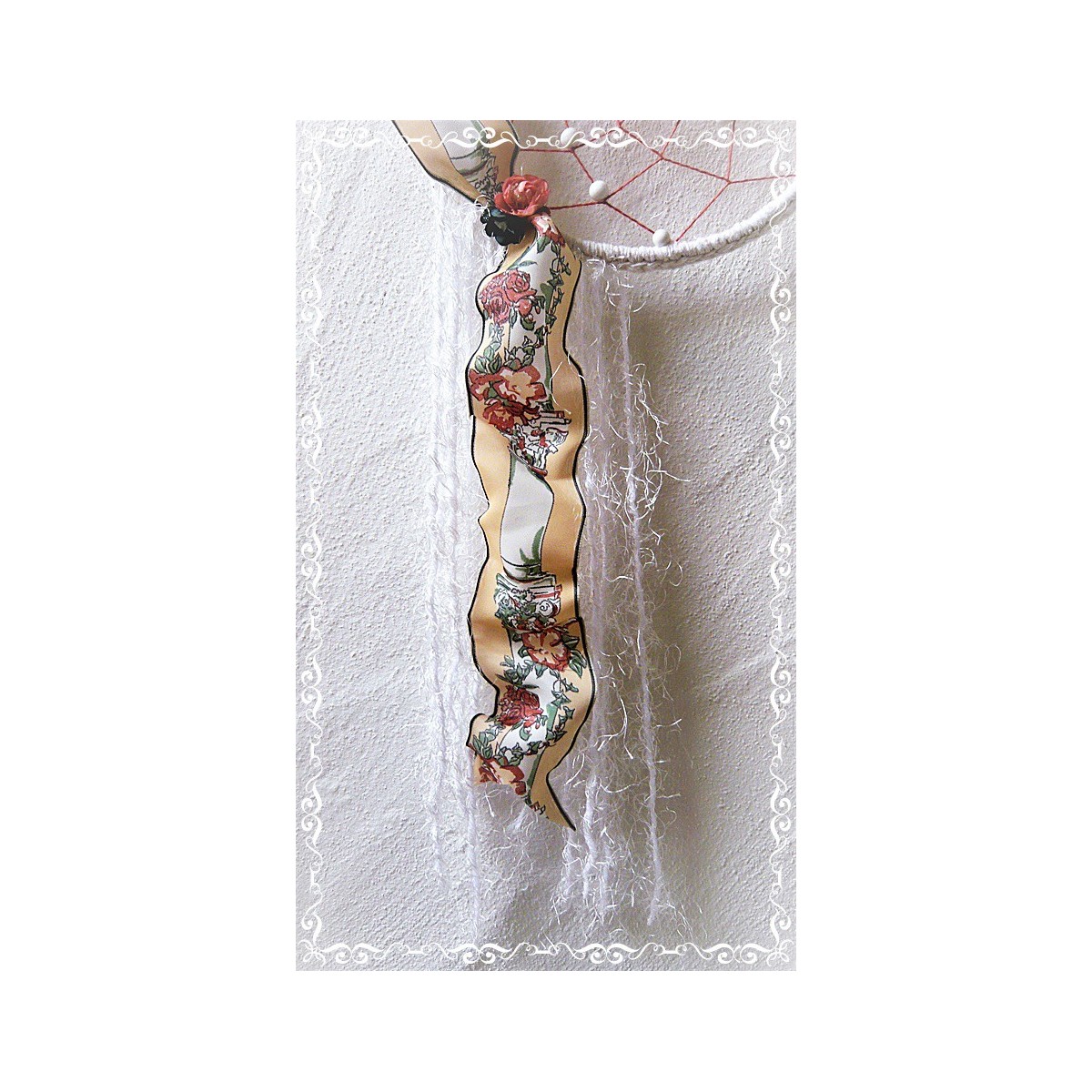 Individuell gefertigter Traumfänger in Ivory und Apricot, der eine romantische Stimmung verbreitet.