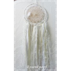UNIKAT♥ Individuell gefertigter, romantischer Traumfänger, der gute Träume einfängt und Schlechte vertreibt. Er wurde aus Wolle, Bändern und Tüll in Weiß und Ivory gefertigt. An Baumwollschnüren aufgefädelte Holzperlen und das handbestickte Vintage Spitzendeckchen setzen verspielte Akzente.