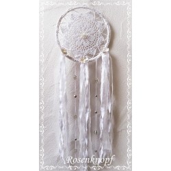 ♥UNIKAT♥ (Nr.20) Individuell gefertigter, romantischer Traumfänger, der der gute Träume einfängt und Schlechte vertreibt. Er wurde aus Wolle, Wäscheleinen, Bändchengarn und Tüll in Weiß gefertigt. Blüten,aufgefädelte Perlen und das gehäkelte Vintage Spitzendeckchen setzen verspielte Akzente.