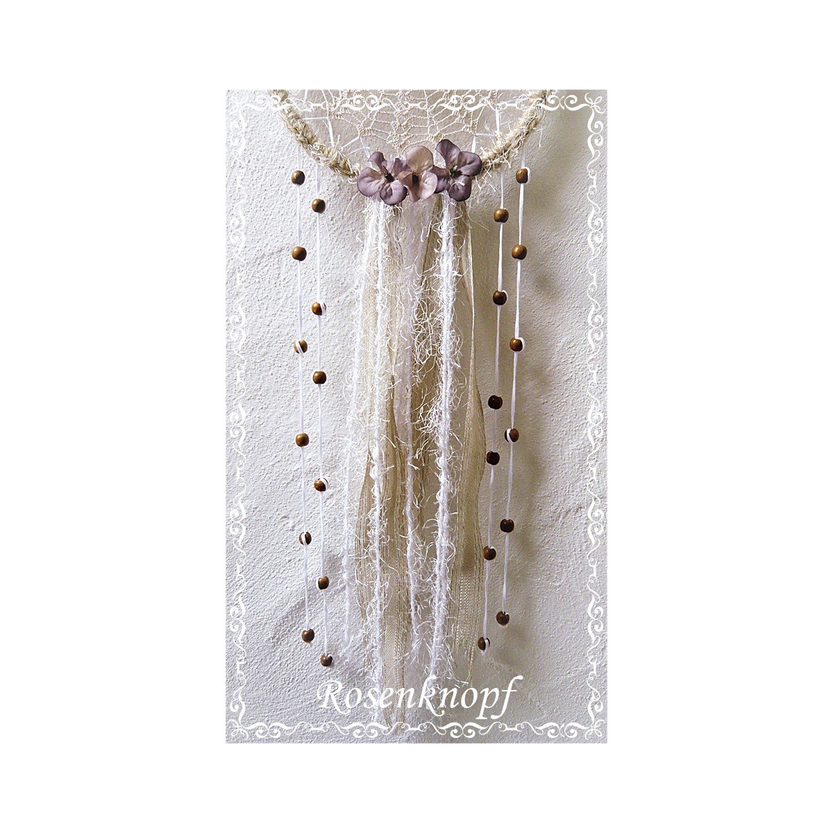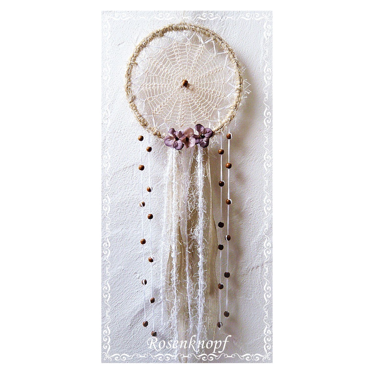 lll➤ Individuell gefertigter Traumfänger in Ivorymit Häkeldeckchen, Hortensienblüten, aufgefädelte Holzperlen, Juteband und Effektgarn.