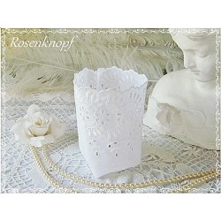 Der romantische Lichtbeutel "Zart-Liebchen" wurde aus feinem Stoff mit floraler Batiststickerei gefertigt. Romantische Akzente erhält das Windlicht durch den feinen Bogenabschluss am oberen Rand. Ein einfaches Glas in das ein Teelicht passt genügt, um diese zauberzarte Stoffhusse zum Strahlen zu bringen!
