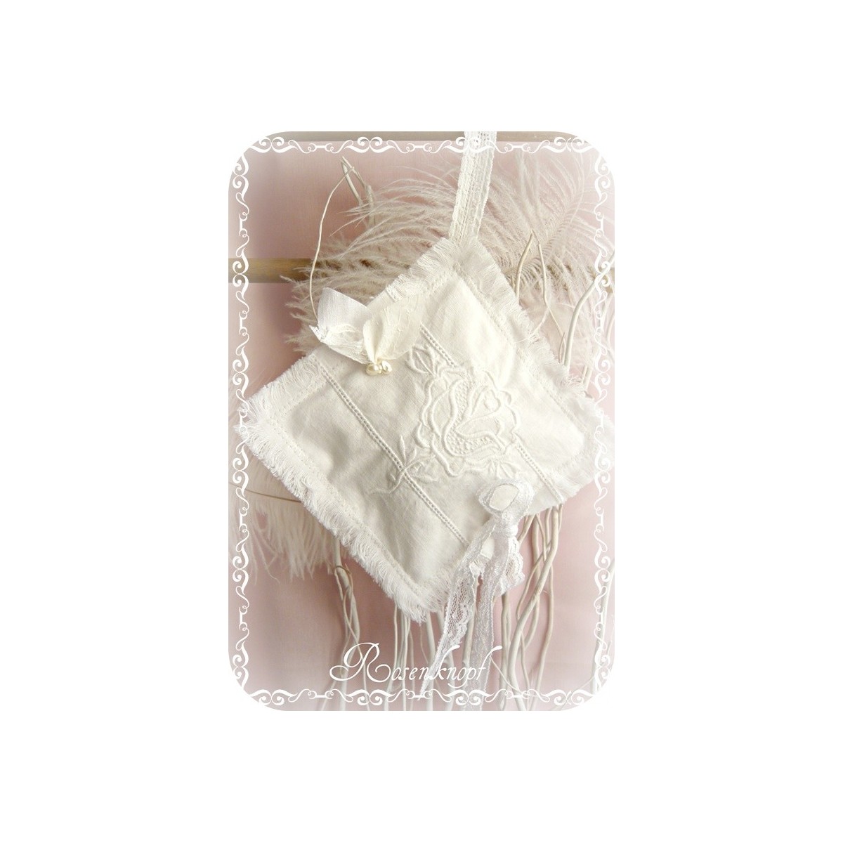 Durch die Spitzenschlaufe an einer Ecke kann das Kissen nicht nur hingelegt, sondern praktischerweise auch aufgehängt werden.