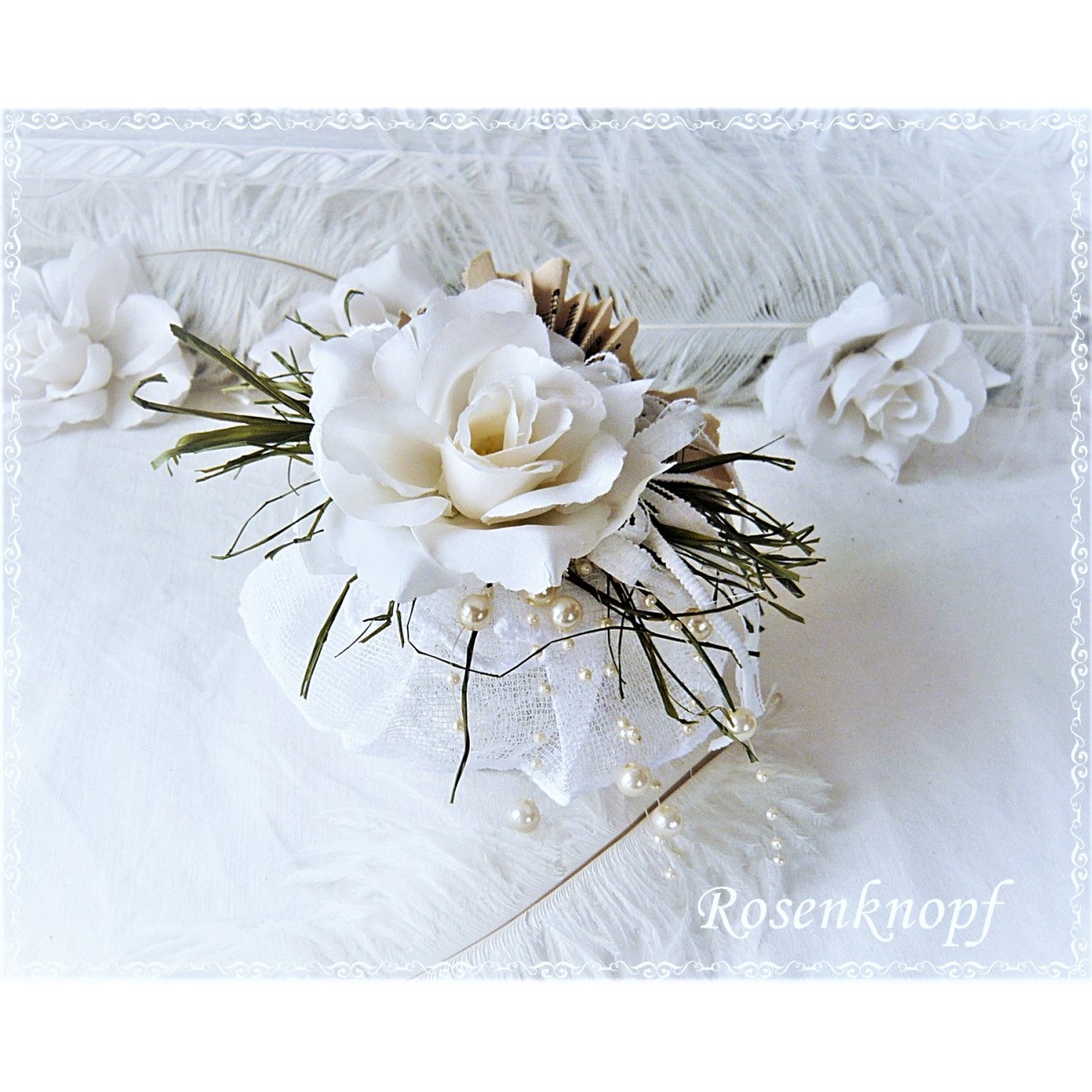 Kleines Gesteck mit einer großen Rose in Ivory die auf einer Tüllrüsche in Weiß sitzt.