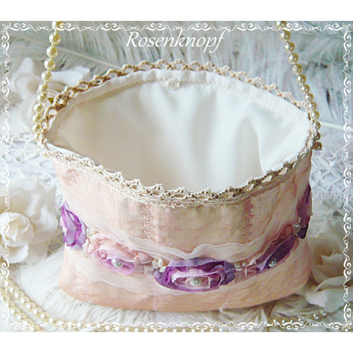 Romantische Akzente erhält das Täschchen durch Abnäher, einem Tüllband mit Rosen in Violett Tönen deren Mitte ich mit aufgenähte Perlen verziert habe.