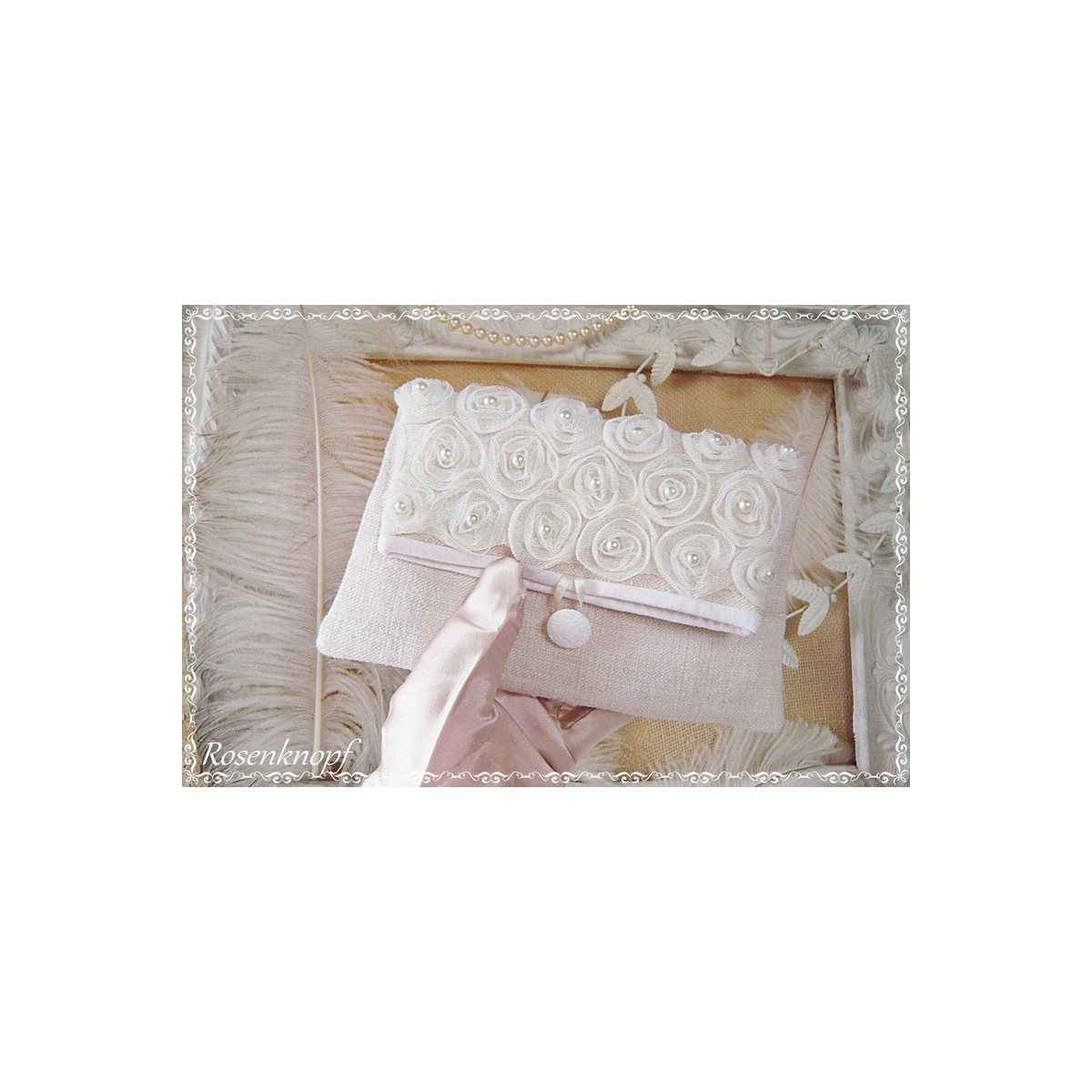 Wunderschöne, mit Perlen verzierte Tüllröschen setzen bei dieser Damenclutch nostalgisch elegante Akzente.