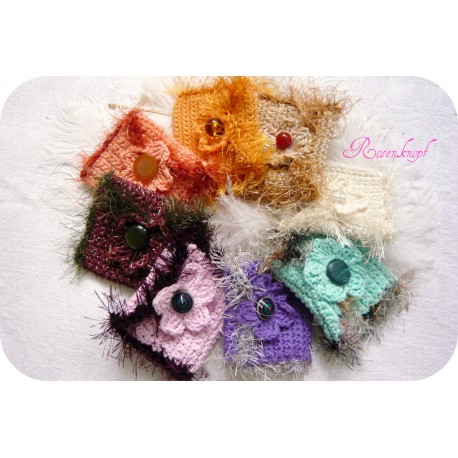Hübsch wirkt der Blütenverschluss für den Knopf und die Umrandung mit farblich abgestimmtem Effektgarn.
