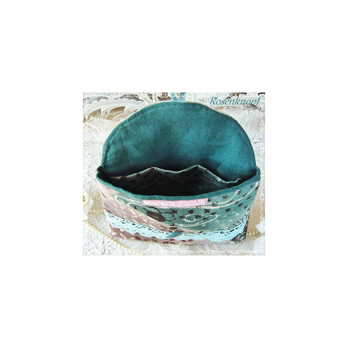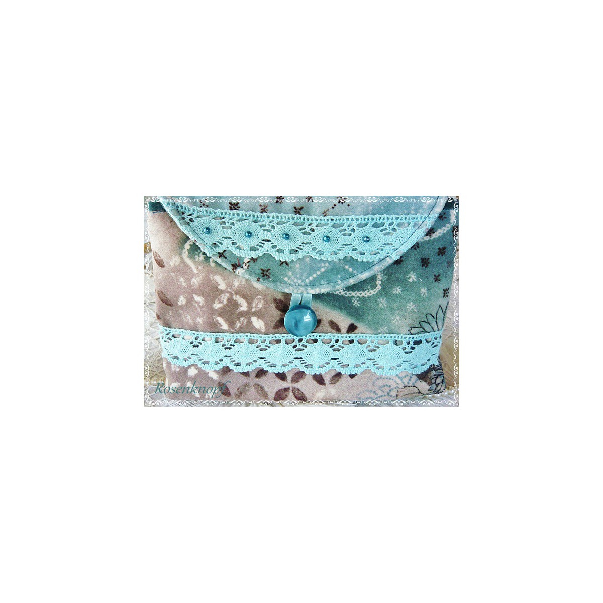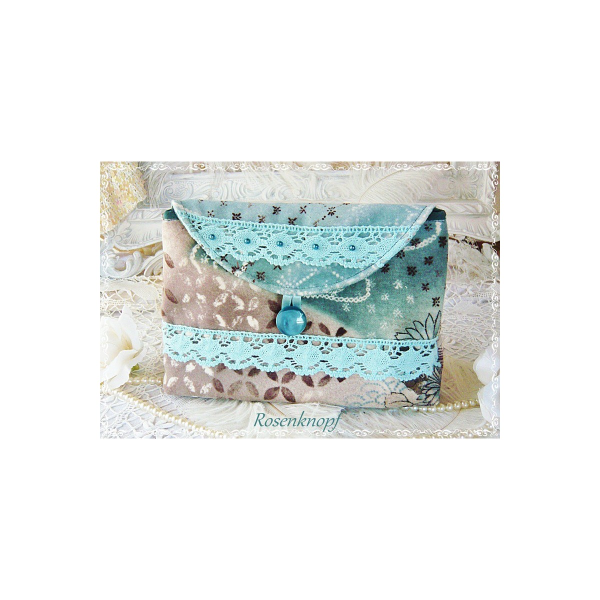 Romantische Akzente erhält das Etui durch aufgenähte Klöppel-Spitze und Perlen in Türkis.