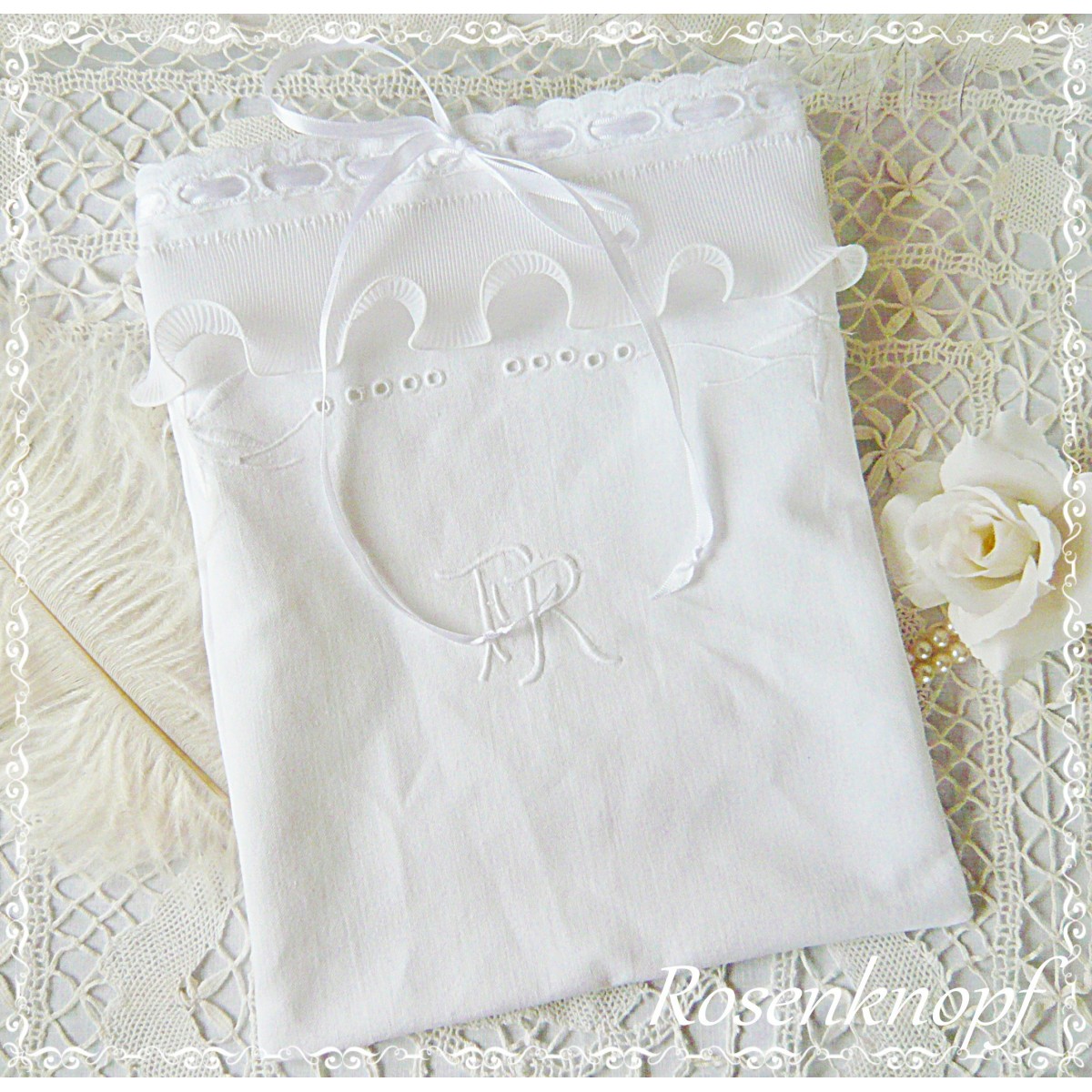 Bestickt ist diese Kostbarkeit aus längst vergangener Zeit, mit einer zauberhaften Loch- und Weißstickerei aus zartem Garn mit den Initialen FR.