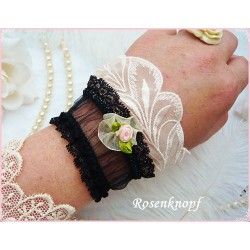 ♥UNIKAT♥ Schlicht und zugleich elegantes und einzigartiges Armband aus elastischer, schwarzer Spitze. "Meyta" wurde aus hauchzartem schwarzem Organza in Kombination mit apricotfarbener Vintage Spitze genäht. Romantische Akzente erhält die Manschette durch das feine Satinröschen in Apricot.