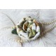 Durch eine spezielle Technik ist diese auf einem dunkelgrünen Stoffblatt befestigte Rosenblüte in Weiß-Ocker-Grün meliert entstanden.