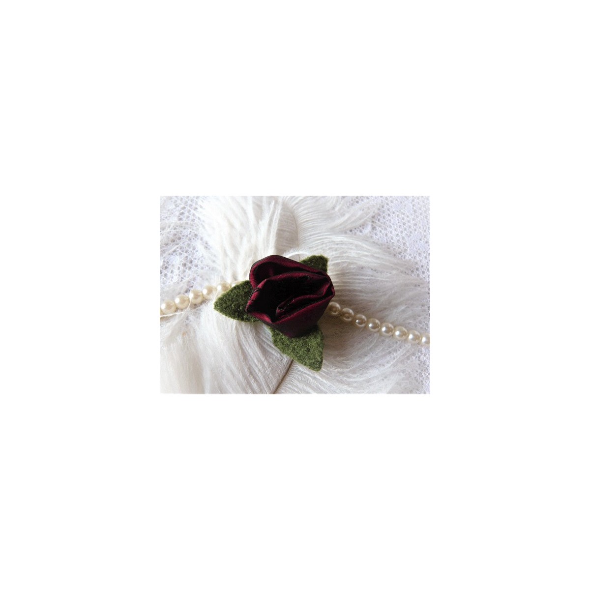 Durch eine spezielle Technik ist diese auf einem grünen Walkblatt befestigte Rosenblüte aus Satin in Dunkelrot entstanden.