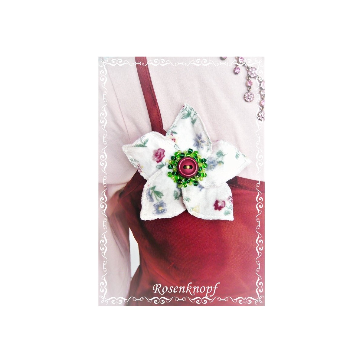 Den "Stempel" bildet ein weinroter Vintage-Knopf, der mit grünen Perlen eingerahmt wurde.