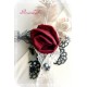 Im Mittelpunkt dieses einzigartigen Ansteckers steht die Rose in leuchtendem Rostrot, umgeben von Vintage-Spitzen, aufgenähten Perlen und einer Fasanenfeder.