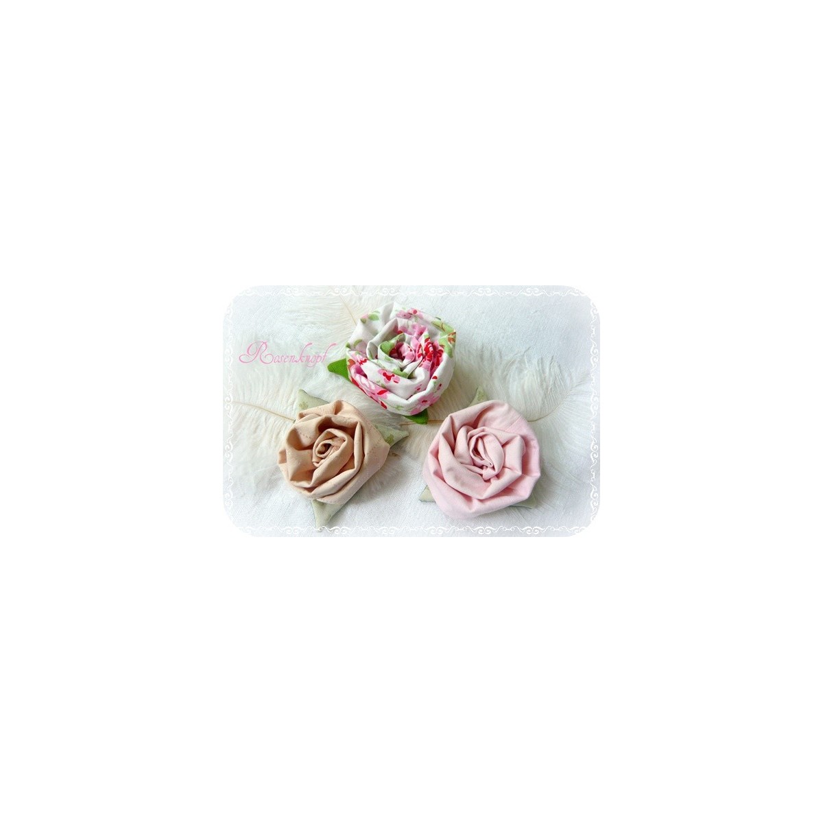 Durch eine spezielle Technik ist diese auf einem grasgrünen Stoffblatt befestigte Rosenblüte aus weißem Stoff mit Rosendruck entstanden.