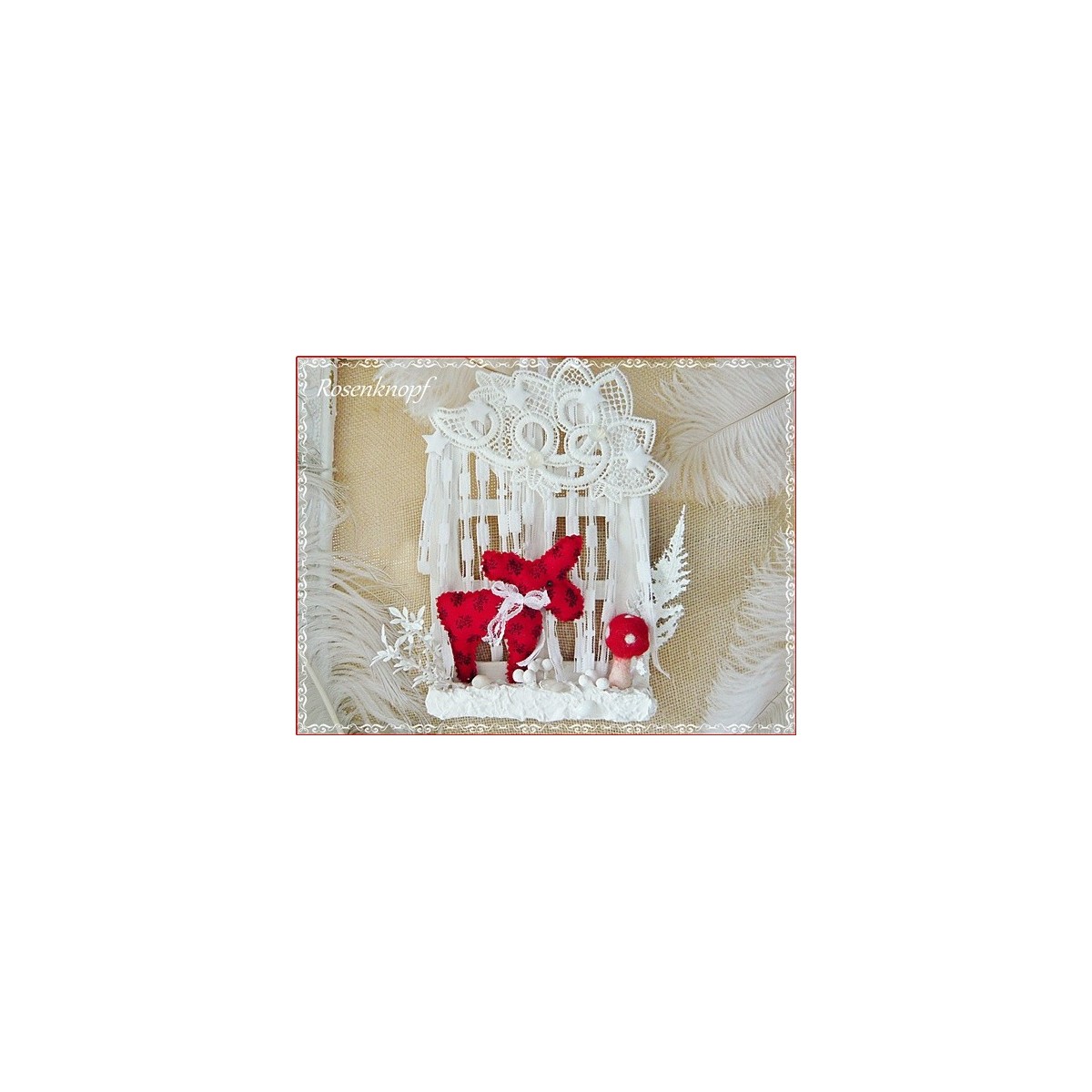 Elch "Knut" wurde im Shabby-Stil genäht, der kleine Pilz ist gefilzt.