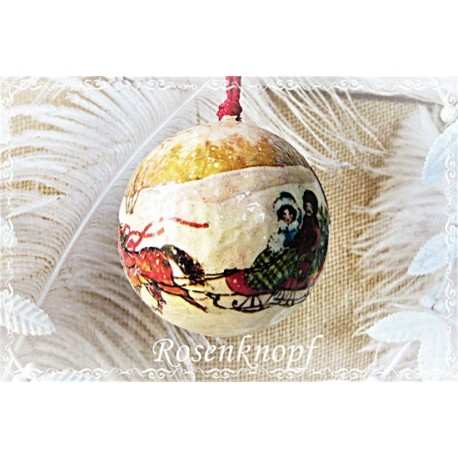 Die Pappmaché Kugel wurde mit winterlichem Motiv aus Pferd, Schlitten und einem Liebespaar verziert.